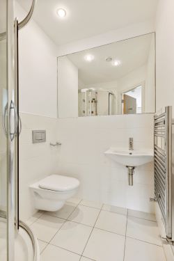 Shower, toilet and wash-hand-basin. Wall-to-wall mirror. Tiled.