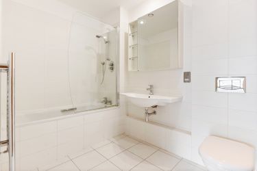 Bath with shower over, wc & whb. Storage cabinet with mirror. Chrome radiator.